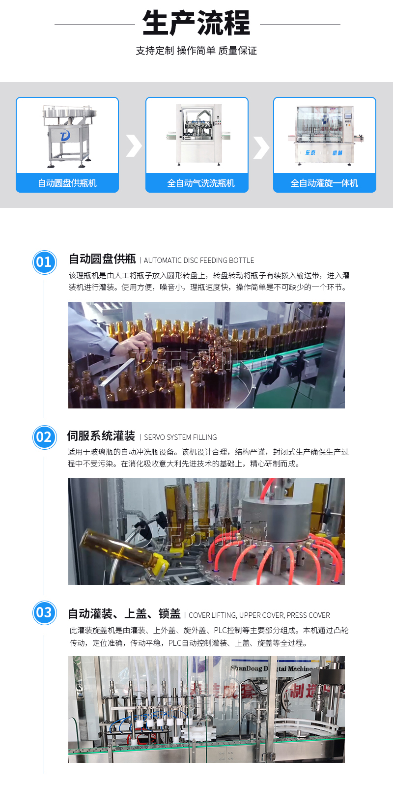 此橄欖油灌裝旋蓋機生產線是由灌裝、上外蓋、旋外蓋、PLC控制等主要部分組成。本機通過凸輪傳動,定位準確,傳動平穩,PLC自動控制灌裝、上蓋、旋蓋等全過程。并可配置全自動注塑機,由吹瓶直接進入灌裝系統,防止交叉感染,整個過程全部在無菌條件下完成,無需洗瓶和烘干。此灌裝旋蓋機適合于食用油、藥品等粘流體的灌裝生產。